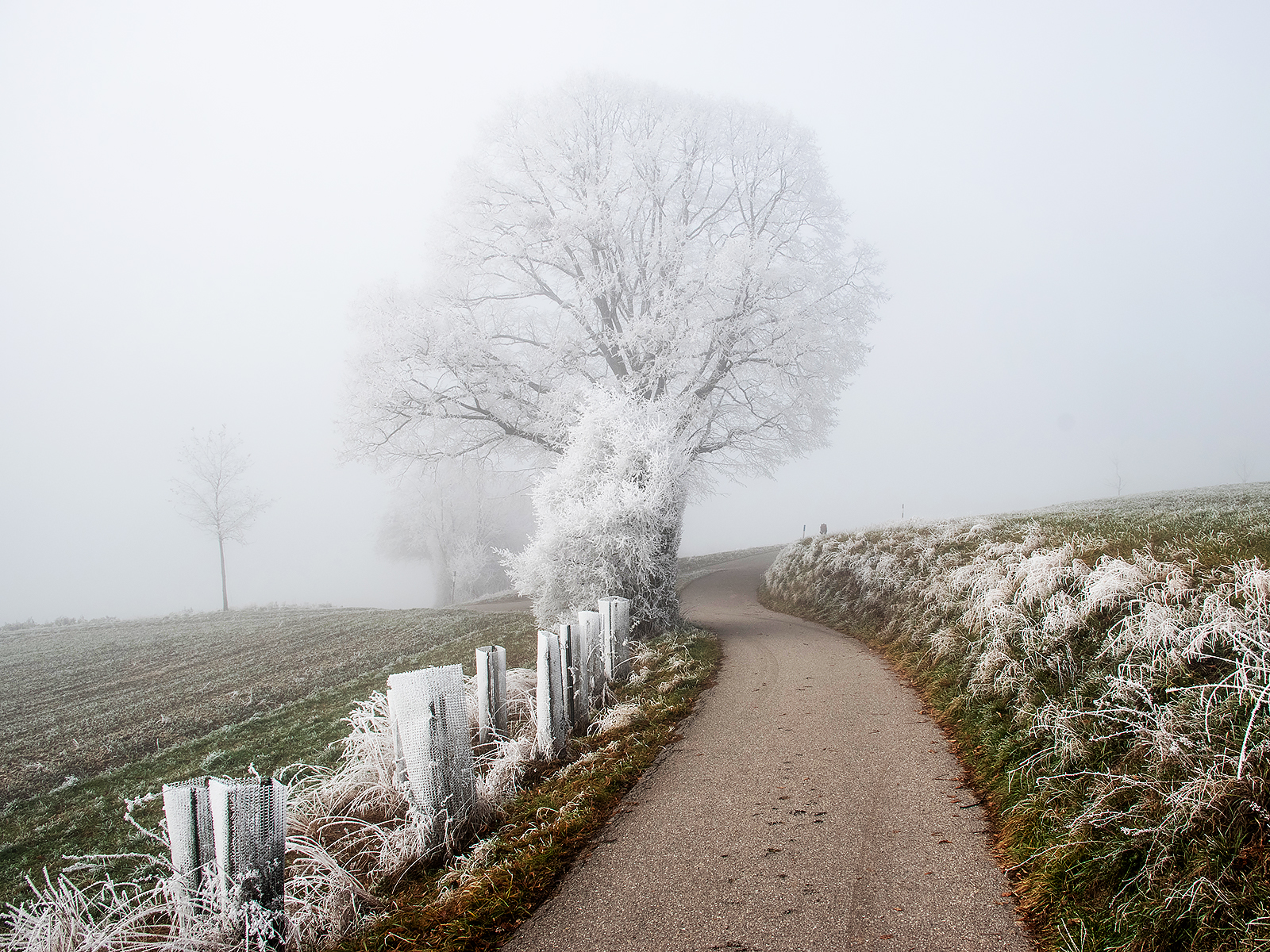 Der Wetterbericht sagte die Obergrenze des Nebels bei 800 Metern voraus. Schon in Bantigen spürte man das Blau. Vorerst erfreuten wir uns am Rauhreif.Am Ende des scheinbaren Tunnels zur Talhöchi dann das erste intensive Blau.