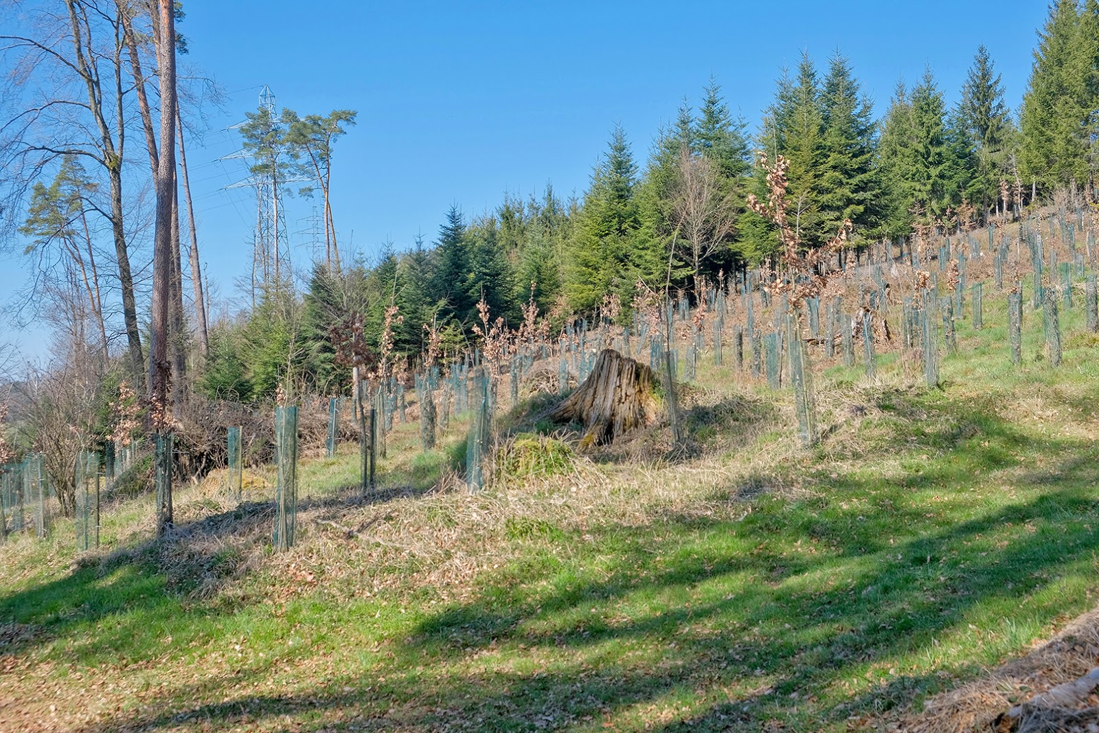 Bei Pt. 713, dem Eingang in den Wald, verlassen wir den Wanderweg. Es zieht mich zu einem Waldstück, zu dem ich eine besondere Beziehung habe. Die Parzelle gehört der Gemeinde Bolligen, und hier habe ich unter der Leitung des ehemaligen Gemeindepräsidenten Hermann Bigler geholfen, nach dem Lothar-Sturm Eichen und Hagebuchen zu pflanzen. Vielleicht erinnert sich in 100 Jahren eine Eiche, dass ich in ihrer Jugend den stützenden Pflock eingeschlagen habe.